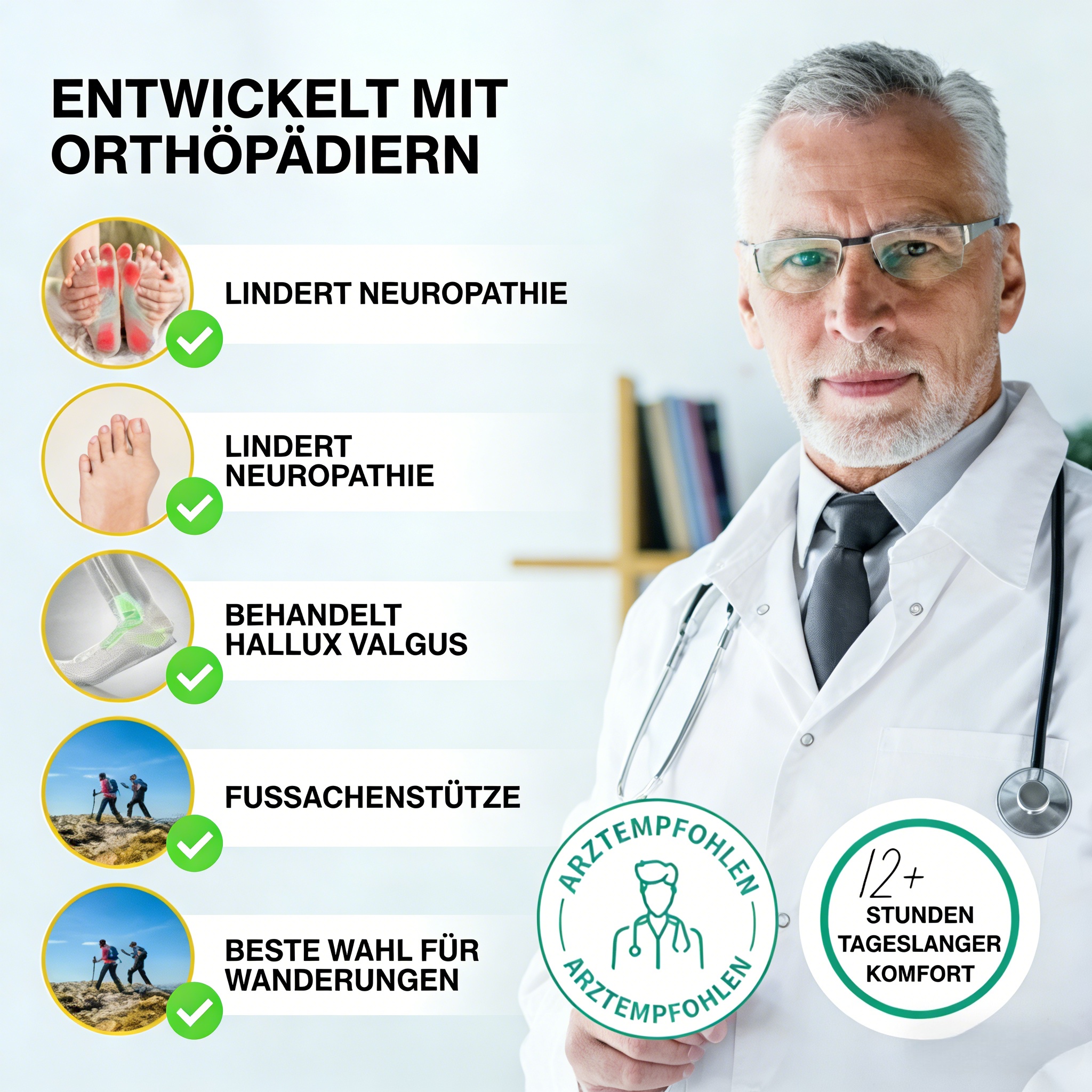 Diese Schuhe sind mit eingebauter orthopädischer Fußgewölbeunterstützung entwickelt, um den Druck auf Ihre Füße, Knie, Hüften und den unteren Rücken zu verringern. Perfekt zur Linderung von Schmerzen, die durch Plantarfasziitis, Plattfüße, Hallux Valgus und diabetesbedingte Fußprobleme verursacht werden – damit Sie bei jedem Schritt bequem gehen können.